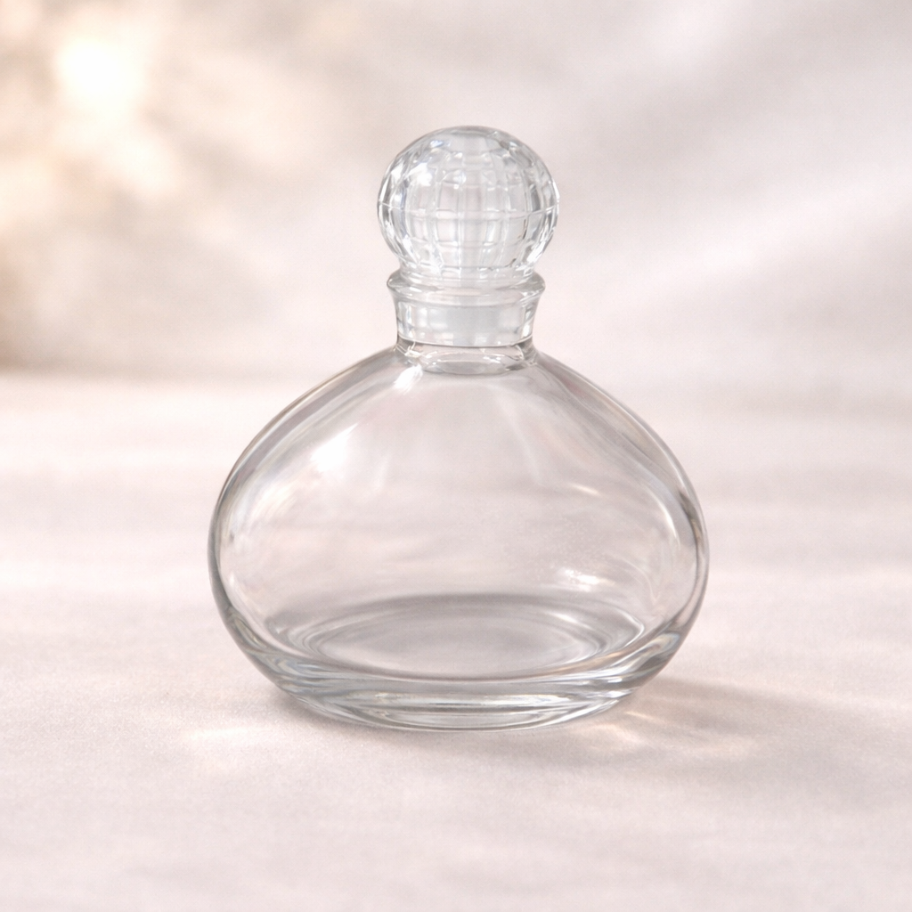 Minimal Yuvarlak Cam Parfüm/Kolonya Şişesi – Kristal Kapaklı